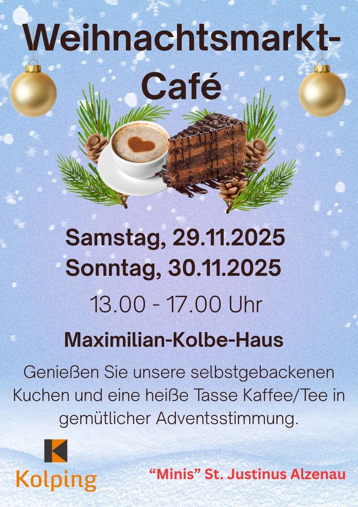 Die Kolpingsfamilie Alzenau und die „Minis“ St. Justinus Alzenau laden Sie herzlich ein zum gemütlichen Weihnachtsmarkt-Café im Maximilian-Kolbe-Haus.
