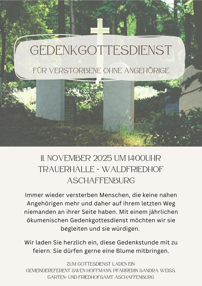 Der erste ökumenischer Gedenkgottesdienst findet am 11. November um 14:00Uhr in der Trauerhalle auf dem Waldfriedhof in Aschaffenburg statt.
