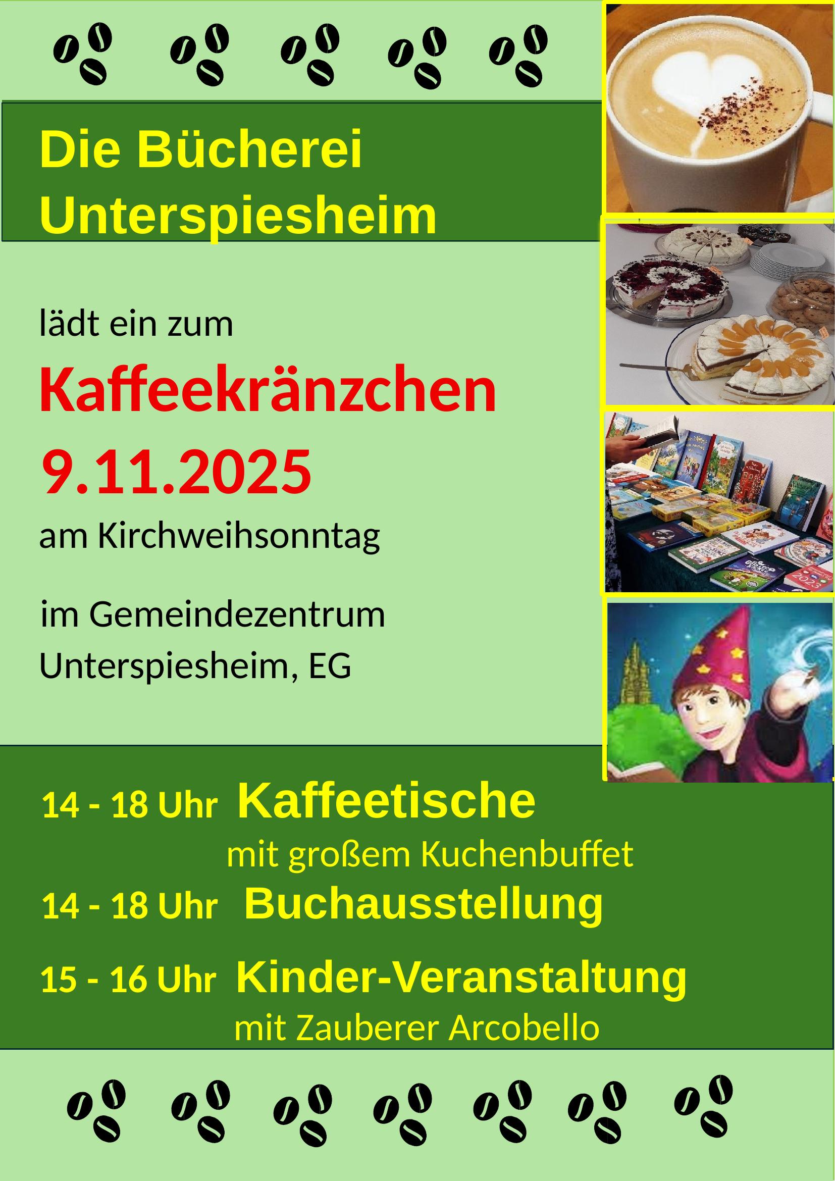 Für Kaffee und Kuchen bitten wir um eine Spende. Den Erlös davon werden wir vollständig der Büchereiarbeit zuführen.