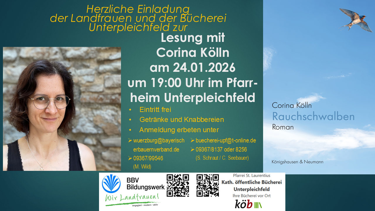 Herzliche Einladung der Landfrauen und der Bücherei Unterpleichfeld zur Lesung mit Corina Kölln am Samstag, 24.01.2026 um 19 Uhr im Pfarrheim Unterpleichfeld
