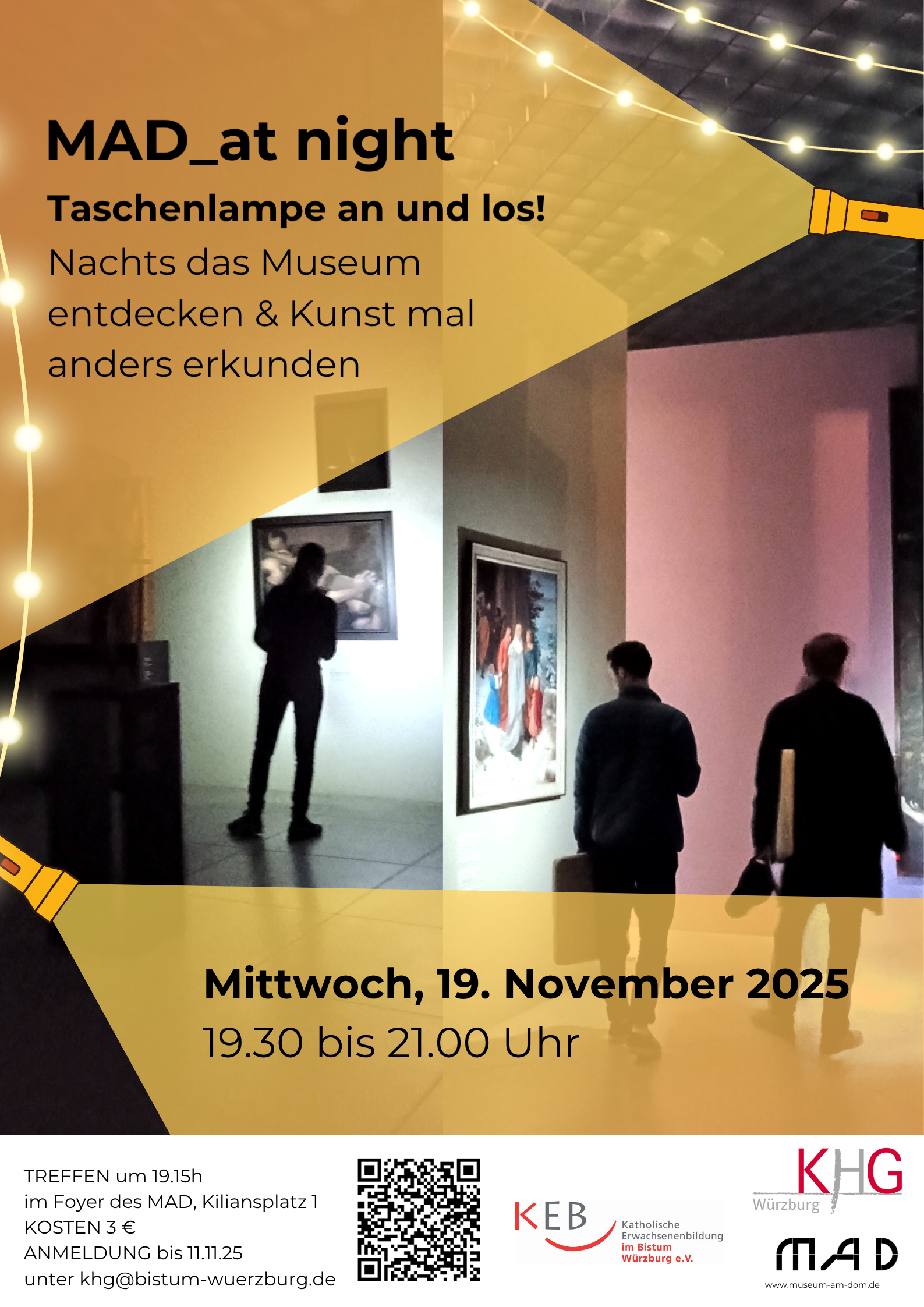 Im grauen November bringen wir Farbe in den Alltag! Wir erkunden das MAD (Museum am Dom) mit seinen Kunstwerken vom 10. bis zum 21. Jahrhundert – und zwar am Abend. Taschenlampe an und die bunten Themenwelten entdecken – was begegnet dir zwischen Skulpturen von Riemenschneider, Barlach oder Kollwitz? Was lösen die Werke von Warhol oder Haring, moderne Grafiken oder Video- und Audioinstallationen bei dir aus?