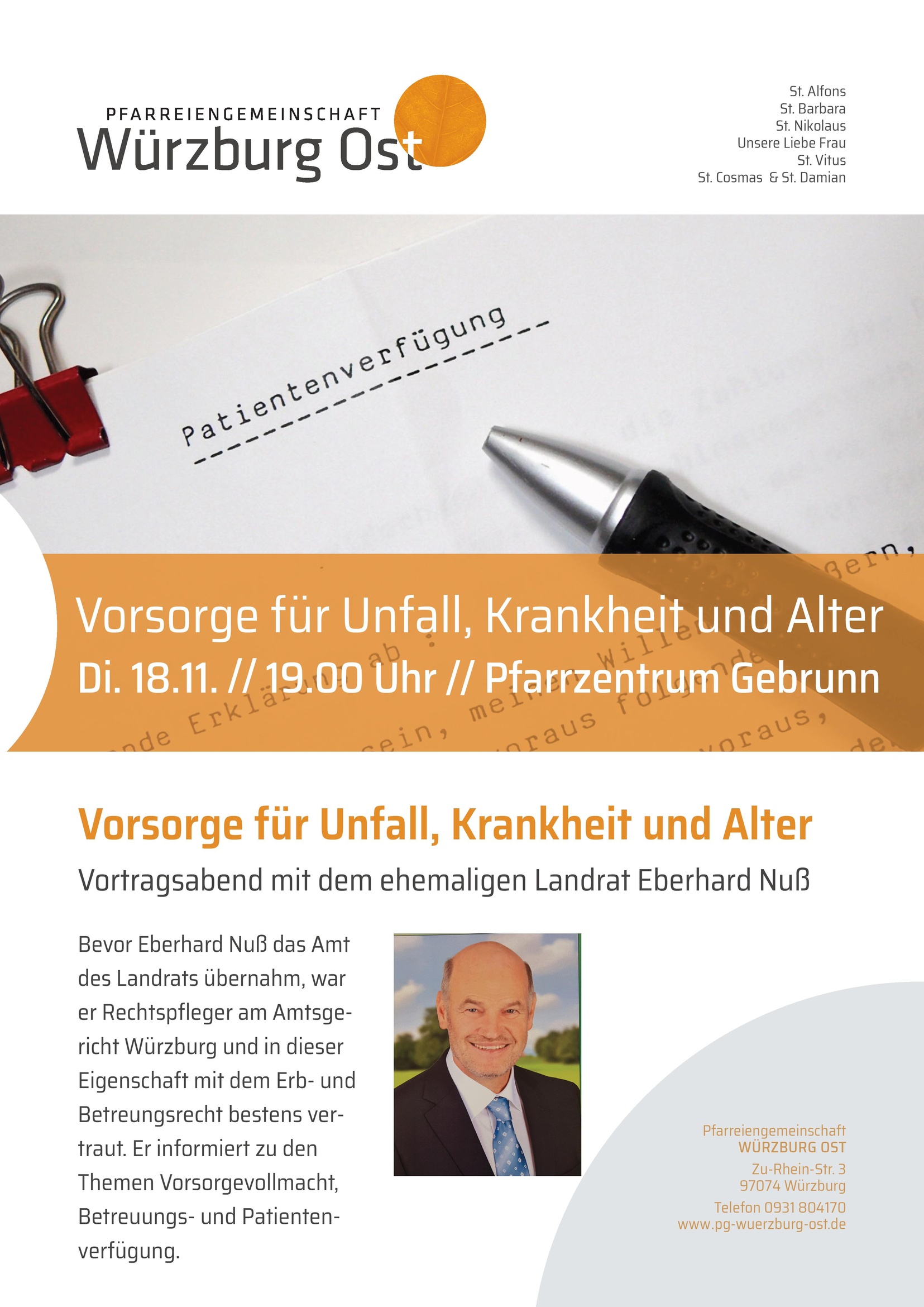 Bevor Eberhard Nuß das Amt des Landrats übernahm, war er Rechtspfleger am Amtsgericht Würzburg und in dieser Eigenschaft mit dem Erbrecht bestens vertraut. Er informiert zu den Themen Vorsorgevollmacht, Betreuungsverfügung und Patientenverfügung: